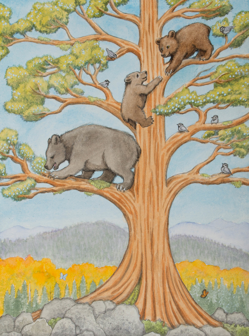 This image came about based on a real sighting I had of a mother bear and her two cubs climbing a juniper in the Sierras near my home.